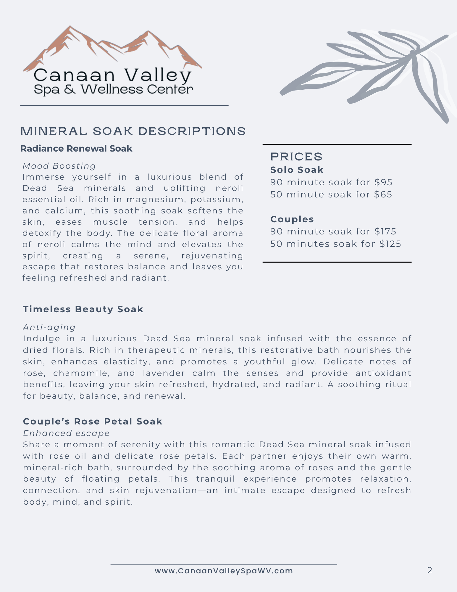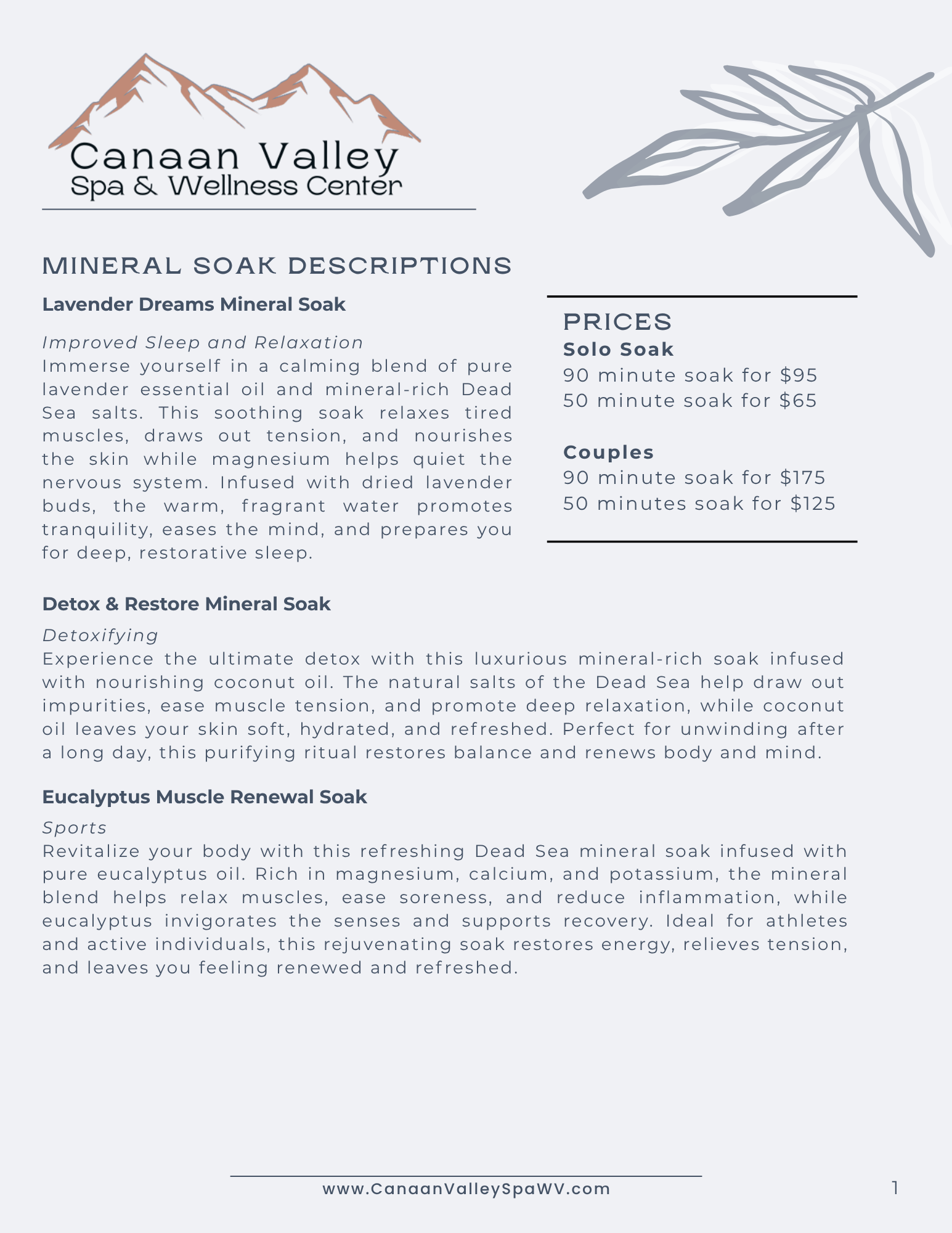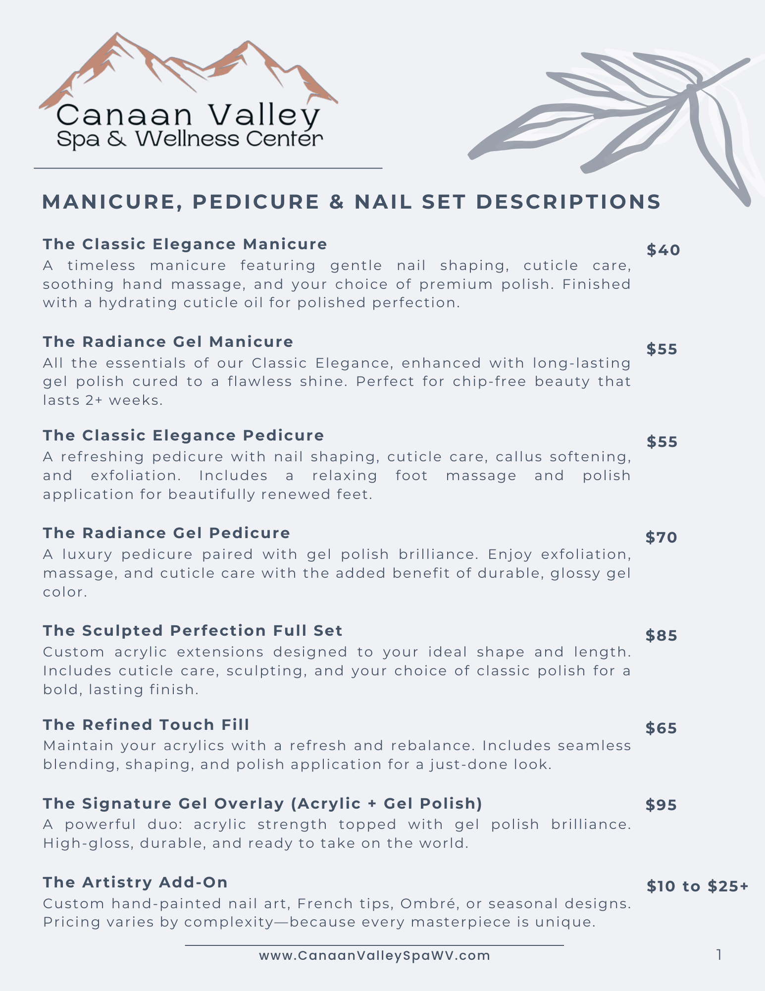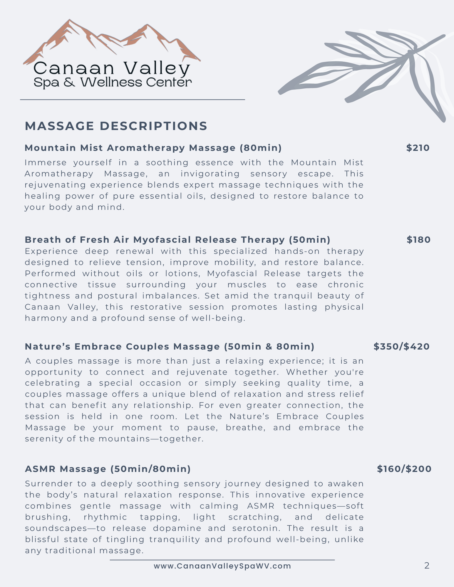 A Sanctuary of Serenity As you step into our spa, you’ll immediately feel a sense of calm wash over you. Surrounded by the natural beauty of Canaan Valley, our facility boasts a peaceful ambiance that invites you to unwind and let go of stress. From the soothing sounds of trickling water to the gentle scent of essential oils, every detail has been carefully curated to create a sanctuary of serenity where you can relax, recharge, and reconnect with yourself.